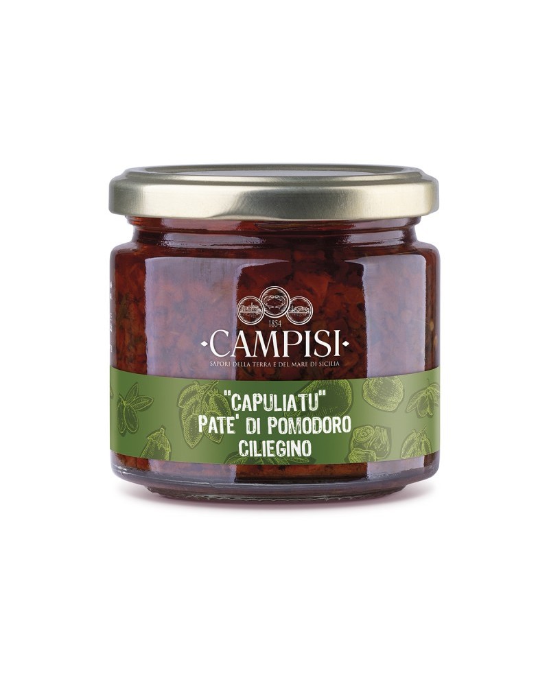 Pate' di pomodoro ciliegino " capuliato " 190g Campisi. Si tratta di una vera e propria crema che potrà essere abbinata a diverse ricette sia di carne che di pesce, per insaporire primi piatti di pasta o come crema da spalmare su tartine o bruschette.