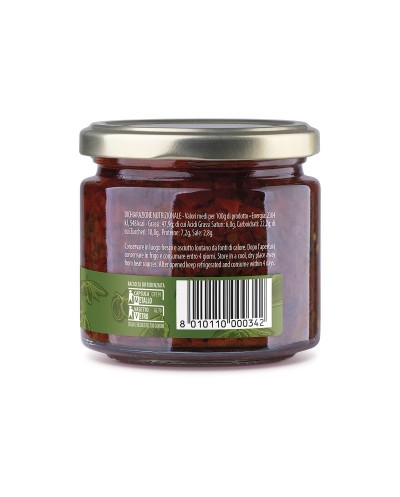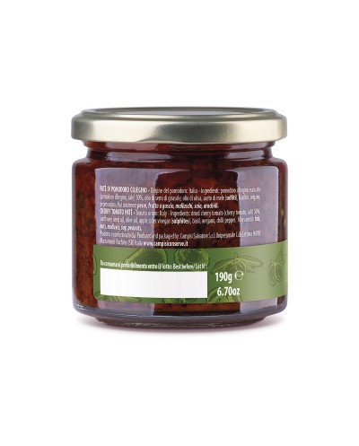 Ingredienti: Pomodoro ciliegino essiccato, olio di semi di girasole, olio di oliva, basilico, origano, aglio, peperoncino, sale marino.