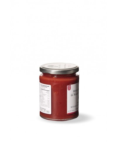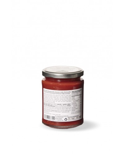 Ingredienti: Salsa di pomodoro (65%), carne di salsiccia di Suino Nero (25%), olio extra vergine di oliva Frantoi Cutrera, cipolla, carote, SEDANO, sale, pepe nero, alloro.