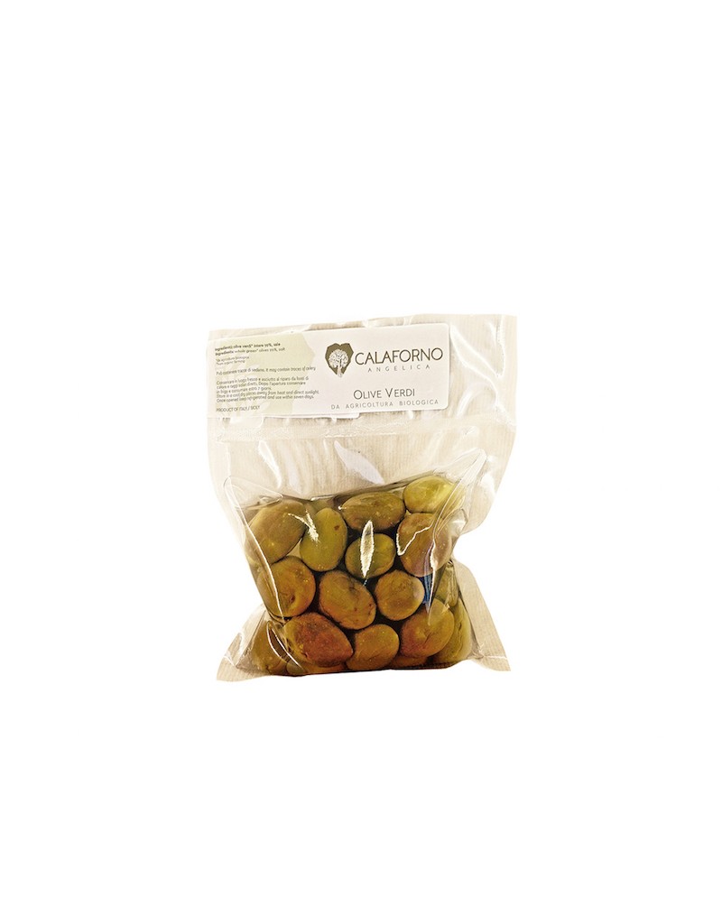 Olive verdi biologiche in salamoia di cultivar Tonda Iblea e Nocellara lavorate con il metodo naturale (acqua e sale marino).