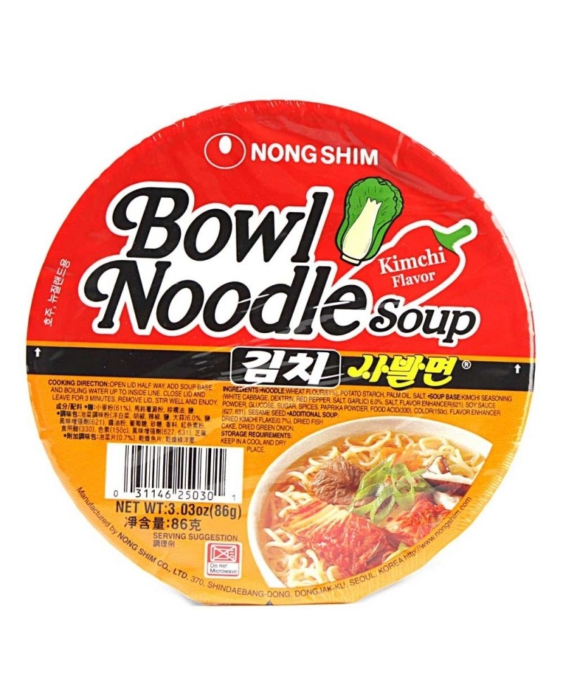 I Nongshim Bowl Noodle Kimchi Noodles sono un ramen istantaneo in ciotola che cattura il sapore autentico e speziato del Kimchi coreano (cavolo fermentato piccante). Offrono noodles sottili in un brodo saporito, piccante e leggermente acidulo, arricchito con fiocchi di Kimchi e verdure. È un'opzione veloce e confortante per gustare uno dei sapori più iconici della Corea.