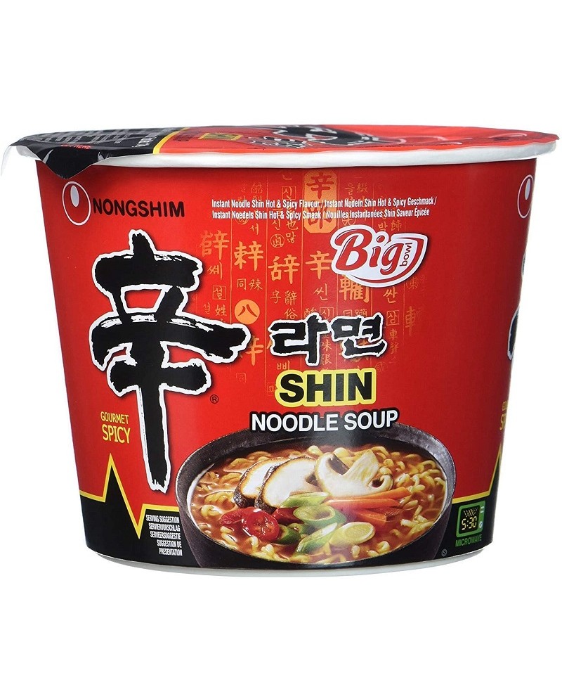 Il Nongshim Big Bowl Shin Noodle è la versione pratica in ciotola del ramen coreano più venduto al mondo, lo Shin Ramyun. Offre noodles spessi e gommosi immersi in un brodo rosso intenso, saporito e decisamente piccante (grazie al peperoncino rosso, aglio e spezie). Arricchito con fiocchi di verdure e funghi, è la soluzione ideale per un pasto coreano caldo e rapido per chi ama il piccante.