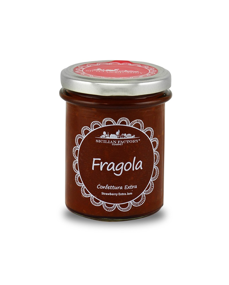 Confettura extra artigianale preparata con un'alta percentuale di fragole siciliane fresche e mature. Caratterizzata da un gusto dolce e vivace e una consistenza ricca di pezzi di frutta. Perfetta per la colazione e per la farcitura di dolci.