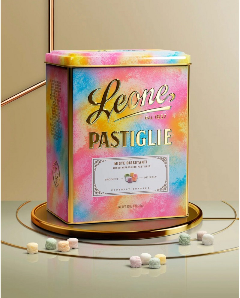 Una grande latta piena di piccoli tesori zuccherini, un'armonia di colori al sapore di limone, arancia, mandarino, fragola, lampone, vaniglia e violetta.