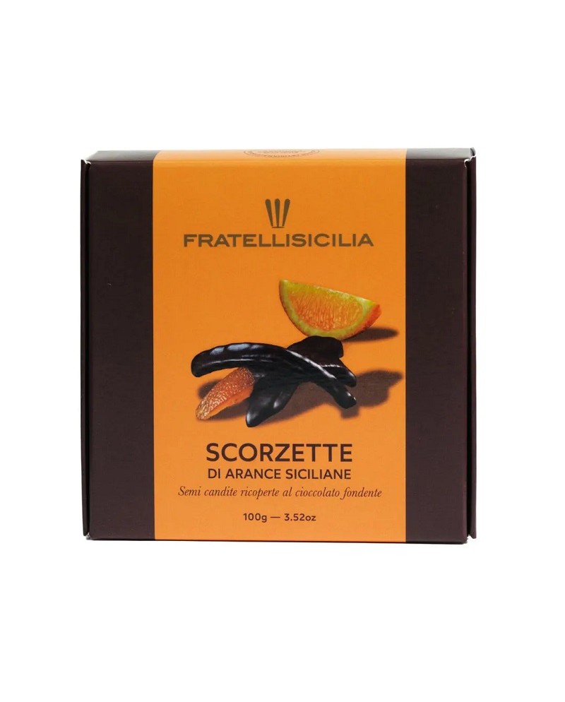 Le Scorzette di Arance di Sicilia ricoperte di cioccolato fondente di Fratelli Sicilia uniscono il gusto intenso e agrumato della Sicilia a quello amaro e avvolgente del cioccolato fondente. Le scorze d'arancia, precedentemente candite artigianalmente per mantenere morbidezza e profumo, vengono immerse in una copertura di cioccolato fondente di alta qualità. Il risultato è un equilibrio tra la freschezza dell'agrume e l'intensità del cacao.