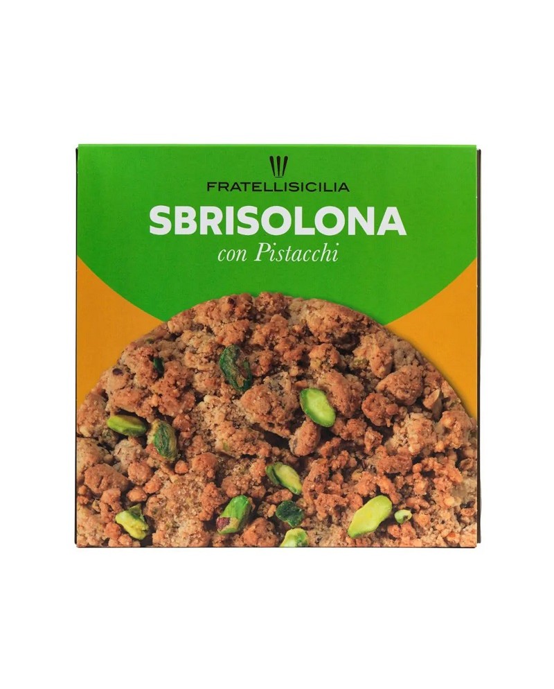 La Torta Sbrisolona con Pistacchi di Fratelli Sicilia è una moderna rivisitazione del tradizionale dolce lombardo, arricchita con il gusto intenso e la croccantezza del pistacchio. Si tratta di un dolce da forno a base di pasta frolla ricca di burro e uova fresche, lavorata in modo da garantire la sua caratteristica consistenza friabile che si "sbriciola" al palato. I pistacchi, sia nell'impasto che in decorazione, conferiscono un sapore tipicamente siciliano e una nota di colore.