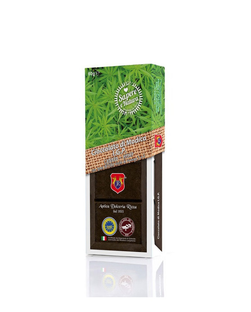 Il Cioccolato di Modica IGP ai Semi di Canapa è una tavoletta da 60g che unisce la purezza del cioccolato modicano con il valore nutrizionale dei semi di canapa (Cannabis Sativa). La lavorazione a freddo (massimo 40/42∘C) mantiene la caratteristica consistenza granulosa e non fonde lo zucchero, preservando le qualità del cacao e la croccantezza dei semi.