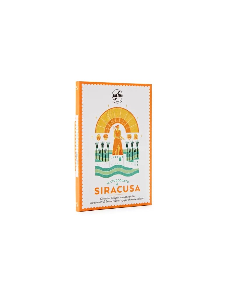 Un cioccolato biologico, lavorato a freddo, fresco e aromatico con scorzette di limone e foglie di menta essiccate.
