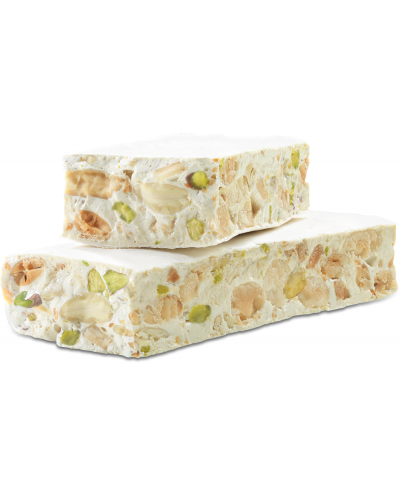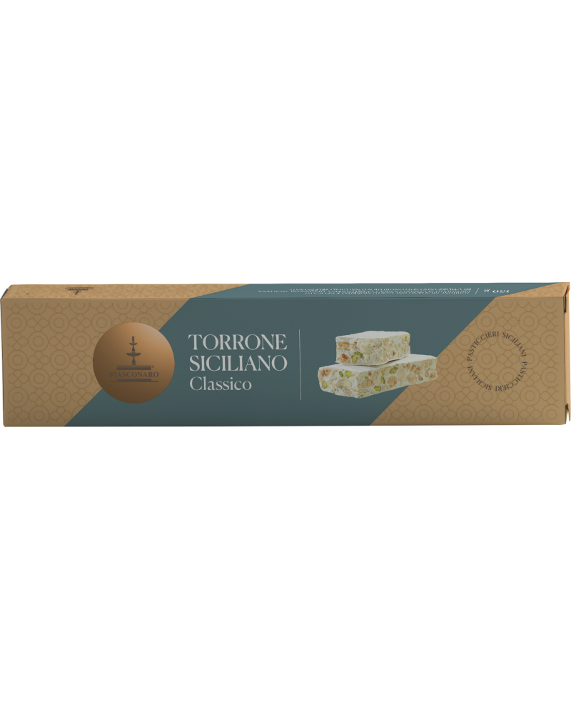 Stecca di torrone morbido artigianale, un classico della tradizione dolciaria siciliana. È caratterizzato da una consistenza cedevole e un sapore ricco, dato dall'alta percentuale di Mandorle e Pistacchi di Sicilia, amalgamati con miele e albume d'uovo. Il torrone non è ricoperto di cioccolato in questa versione "classica".