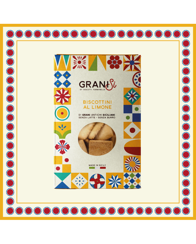Questi biscottini artigianali, della linea Granisi Tumminello, si distinguono per la freschezza e l'aroma intenso del limone di Sicilia, unito al gusto autentico dei grani antichi siciliani (come Maiorca e Timilia). La ricetta è pensata anche per gli intolleranti ai latticini in quanto sono realizzati senza latte né burro, utilizzando olio extravergine d'oliva e uova fresche da galline allevate all'aperto. Sono ideali per una colazione leggera o una pausa profumata.