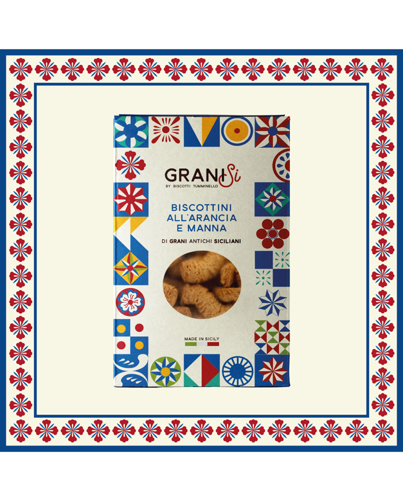 Questi biscottini artigianali siciliani, parte della linea Granisi Tumminello, uniscono il profumo intenso dell'arancia di Sicilia e la dolcezza naturale della manna, resina estratta dal frassino, notevole per il basso contenuto di glucosio e fruttosio. Sono realizzati esclusivamente con pregiati grani antichi siciliani (come Timilia e Maiorca) macinati a pietra e ingredienti genuini, senza olio di palma, grassi idrogenati, conservanti né coloranti.
