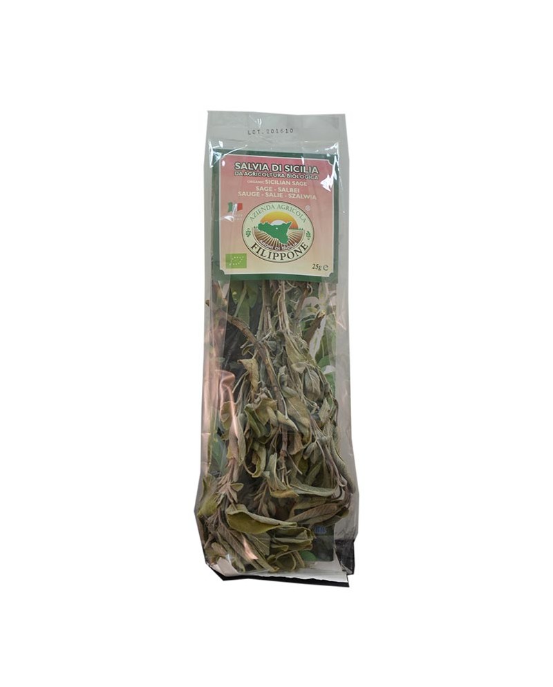 Salvia (Salvia officinalis) in rametti essiccati, coltivata in regime di Agricoltura Biologica in Sicilia, in particolare nell'area del Parco delle Madonie. Le foglie sono raccolte ed essiccate con cura per conservarne l'aroma canforato e balsamico. È un'erba aromatica essenziale per insaporire carni bianche, arrosti, ripieni, burro fuso per condire pasta e gnocchi, e viene anche utilizzata per tisane digestive.