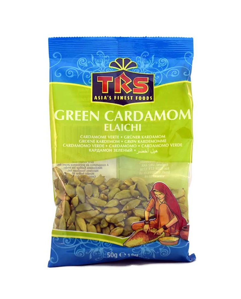 Trs cardamomo verde in confezione da 50g. Il cardamomo verde è una spezia rara e preziosa dal sapore leggermente piccante e fruttato, utilizzabile in svariate ricette, ma anche come curativo in infusi e tisane.