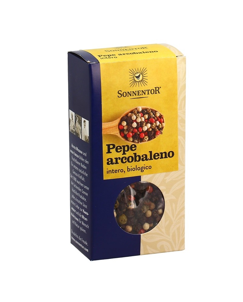 Il Pepe Arcobaleno Intero Bio di Sonnentor è un mix decorativo e aromatico di quattro varietà di pepe, che unisce la piccantezza classica a note fresche e fruttate. Perfetto per macinapepe, si armonizza con carne, pesce, insalate, salse e verdure fresche, offrendo un sapore complesso e bilanciato.