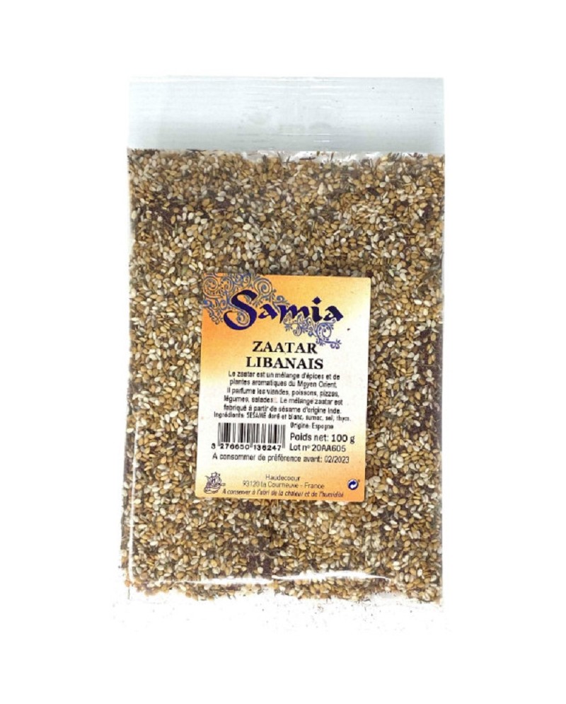 Spezie zaatar alla libanese Samia in confezione da 100g. Lo Zaatar è una miscela di spezie originaria del Medio Oriente. E' tradizionalmente composta da sesamo, sale e timo ma vi sono numerose varianti che prevedono l'aggiunta di altre spezie ed erbe aromatiche, in questo caso il sommacco. In cucina viene utilizzata principalmente per aromatizzare piatti a base di carne, pesce e verdure.