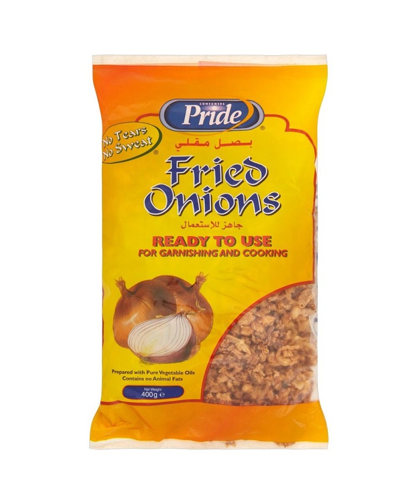 Cipolle fritte Pride croccanti in confezione da 400g. Deliziose cipolle fritte in olio 100% vegetale. Ideali per guarnire contorni o antipasti. Il prodotto non contiene grassi animali.