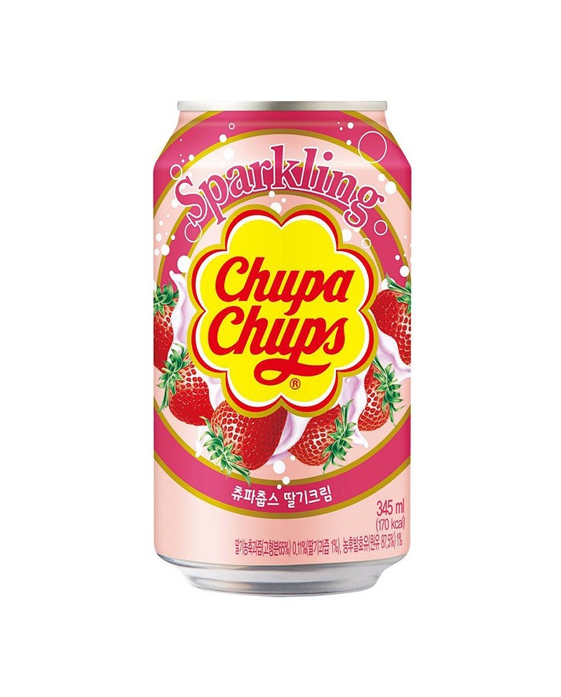 Chupa Chups strawberry cream in lattina da 345ml. Bevanda frizzante al gusto cremoso con fragola ispirata al famoso lecca-lecca dal sapore unico ed inimitabile.