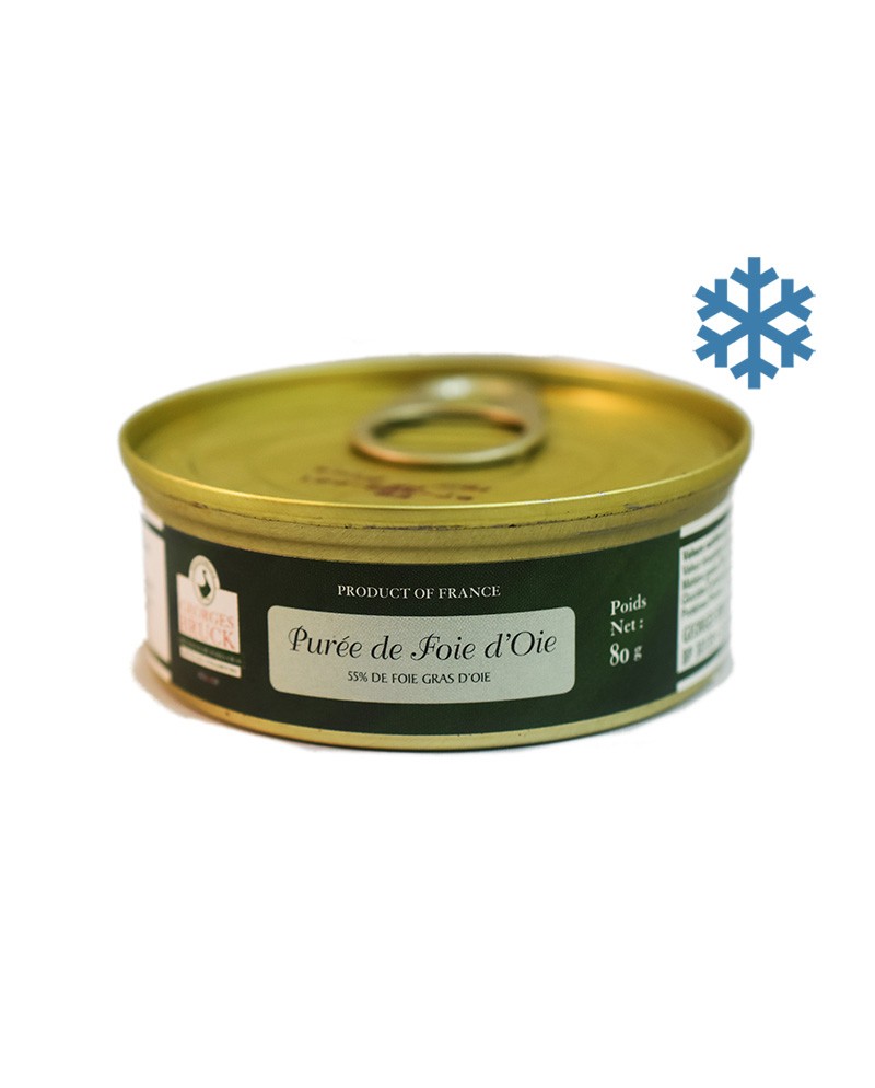Puree fegato d'oca Georges Bruck in scatola di latta da 80g. La qualità della produzione di Georges Bruck è il risultato di una lunga esperienza, unita ad una tecnologia all’avanguardia. Il fegato grasso crudo,dopo essere stato svenato, salato e speziato, viene messo a cuocere e diventa ,grazie a precise lavorazioni, il miglior foie gras al mondo.