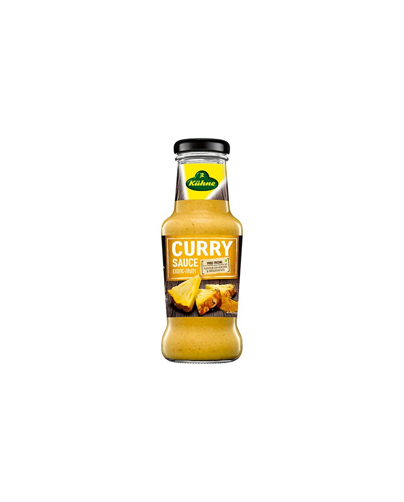 Salsa curry Kuhne in bottiglietta da 250g. Salsa al curry fruttata con pezzetti di ananas senza conservanti dal gusto dolce ed esotico.