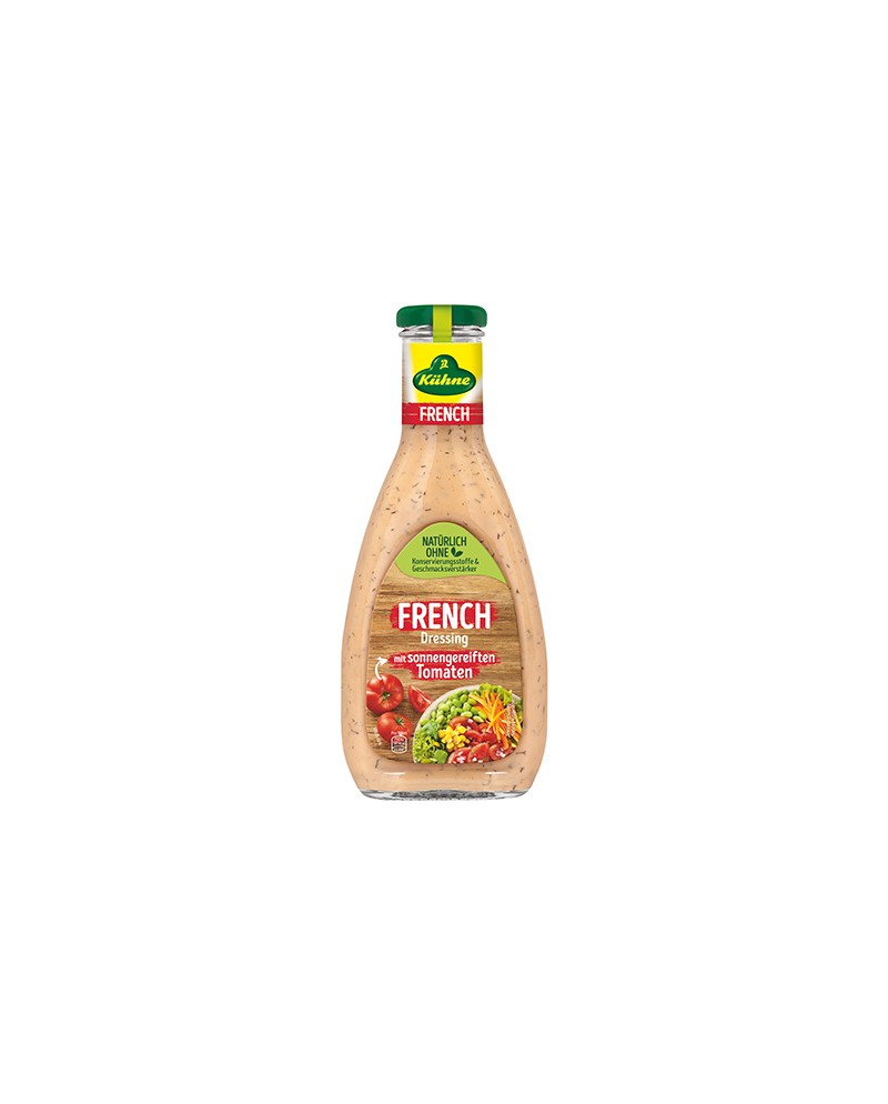 Salsa francese Kuhne in bottiglia da 250ml. Delizioso dressing con passata di pomodoro, erbe e pezzi di cipolla.