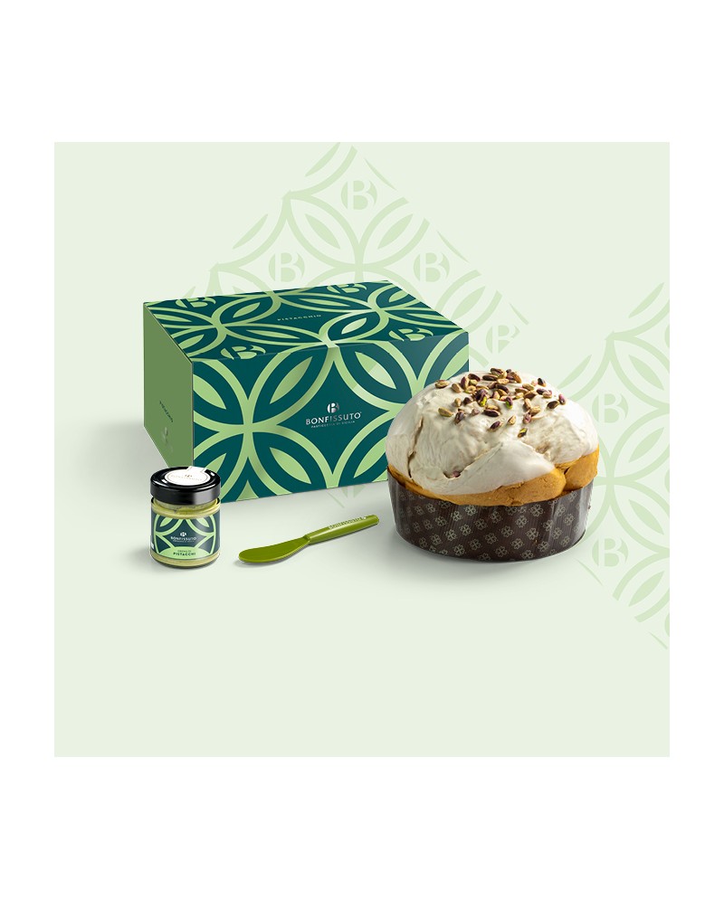 Panettone al pistacchio con copertura di cioccolato bianco e pistacchi tostati. All’interno un barattolo da 200 gr di crema di pistacchi e uno spalmino.