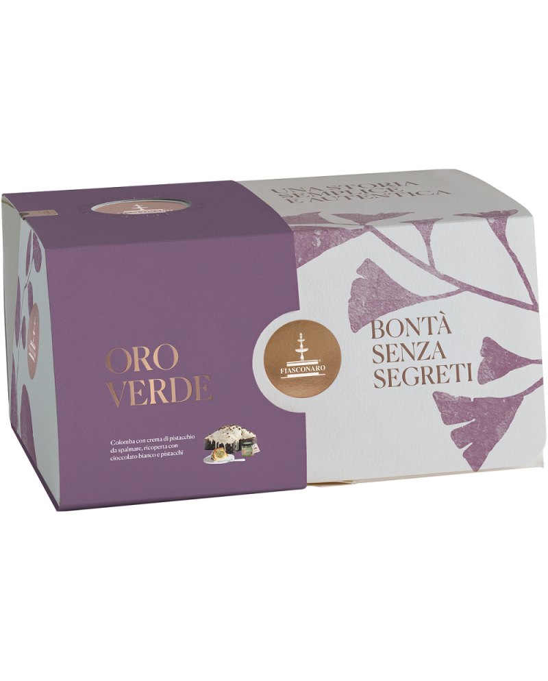 Colomba oro verde Fiasconaro in confezione da 1kg. Soffice delizia con crema di pistacchio da spalmare, ricoperta di cioccolato bianco e pistacchio. Confezionata a mano.