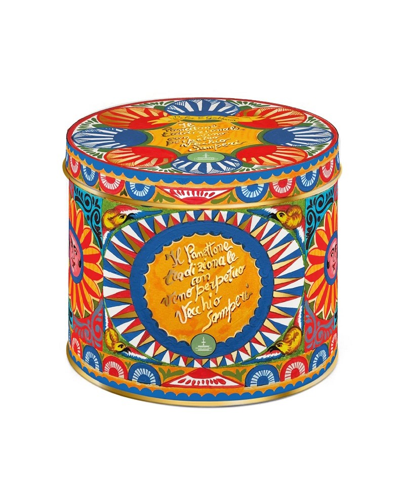 Panettone artigianale da 1 kg a lievitazione naturale, con farina di Sicilia, arricchito da uvetta sultanina aromatizzata al Vino Perpetuo Vecchio Samperi, scorze di arancia candita di Sicilia e cedro diamante. La confezione include una boccetta con nebulizzatore di Vecchio Samperi per esaltarne il gusto prima del consumo, ed è custodito in una latta da collezione D&G.