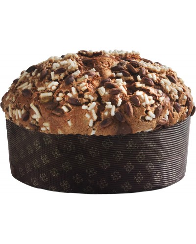 Panettone artigianale a lievitazione naturale (36 ore) con cubetti di albicocca e ananas canditi, ricoperto di glassa e granella di pistacchio.