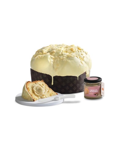 Panettone artigianale a lenta lievitazione naturale (36 ore), con copertura di cioccolato bianco e fogliame di mandorle (senza uvetta e canditi di agrumi nell'impasto), accompagnato da un vasetto di crema di Mandorla (31%) da spalmare.