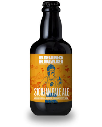 Birra Sicilian Pale Ale Ribadi in bottiglia di vetro da 75cl. Birra fruttata e speziata dal profumo di agrumi, leggermente amara. Prodotta con grano Perciasacchi, bucce di agrumi di Sicilia, bacche di sommacco (Rhus Coriaria) e bacche di pepe rosa. Ottima da aperitivo, predilige sapori forti.