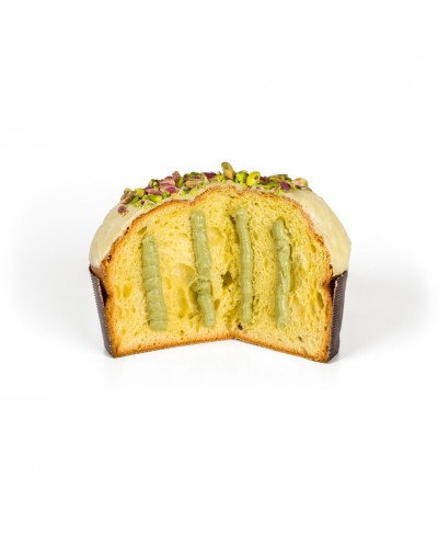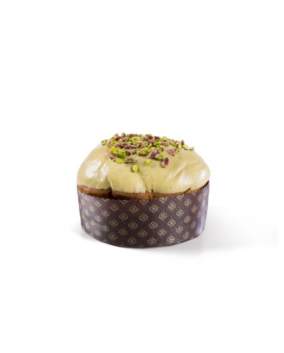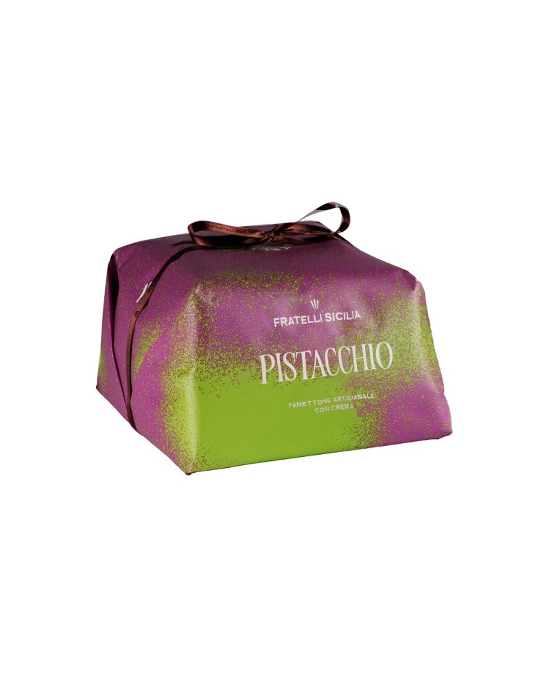 Panettone artigianale da 1 kg, a lievitazione naturale. Questo dolce è farcito internamente con una generosa quantità di crema al pistacchio di Sicilia, che ne conferisce un sapore intenso e una consistenza ricca. Solitamente, è glassato esternamente con cioccolato bianco e cosparso di granella di pistacchio. Un prodotto di alta pasticceria siciliana per gli amanti del pistacchio.