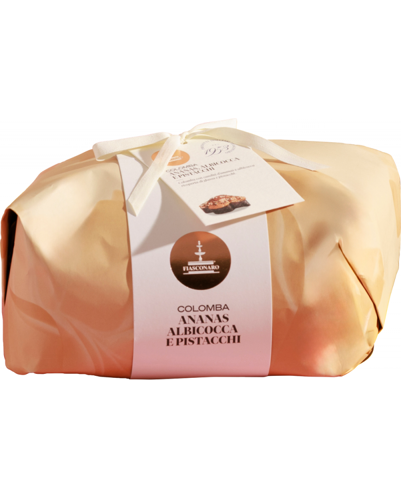 Colomba ananas e albicocca Fiasconaro in confezione da 1kg. Colomba con canditi d’ananas e albicocca, ricoperta di glassa e pistacchi. Confezionata a mano.