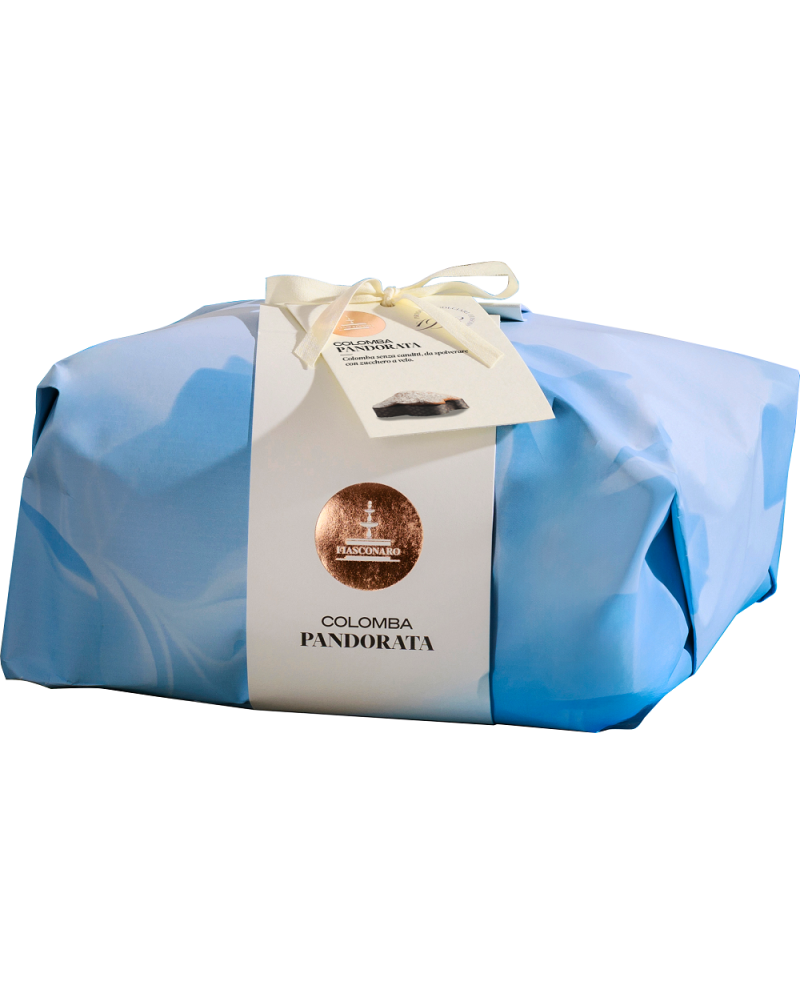 Colomba pandorata Fiasconaro in confezione da 1kg. Delizioso impasto senza uvetta e canditi, ricoperto di glassa e zucchero a velo.