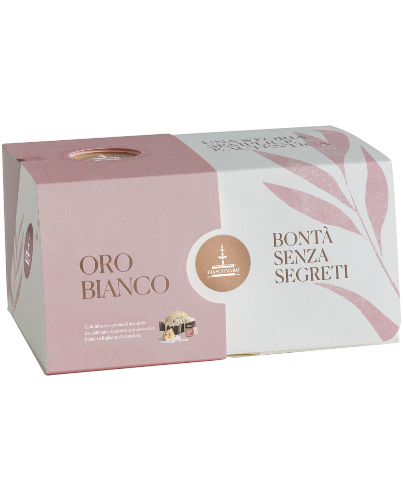 Colomba oro bianco Fiasconaro in confezione da 1kg. Soffice delizia con crema di mandorle da spalmare, ricoperta di cioccolato bianco e fogliame di mandorle.