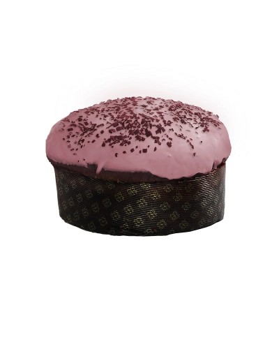 Panettone artigianale a lenta lievitazione naturale (senza uvetta e agrumi canditi) con fragole semi-candite e confettura extra di ciliegie siciliane, ricoperto di cioccolato di copertura con croccantini al lampone e aromatizzato con olio essenziale di menta, incartato a mano.