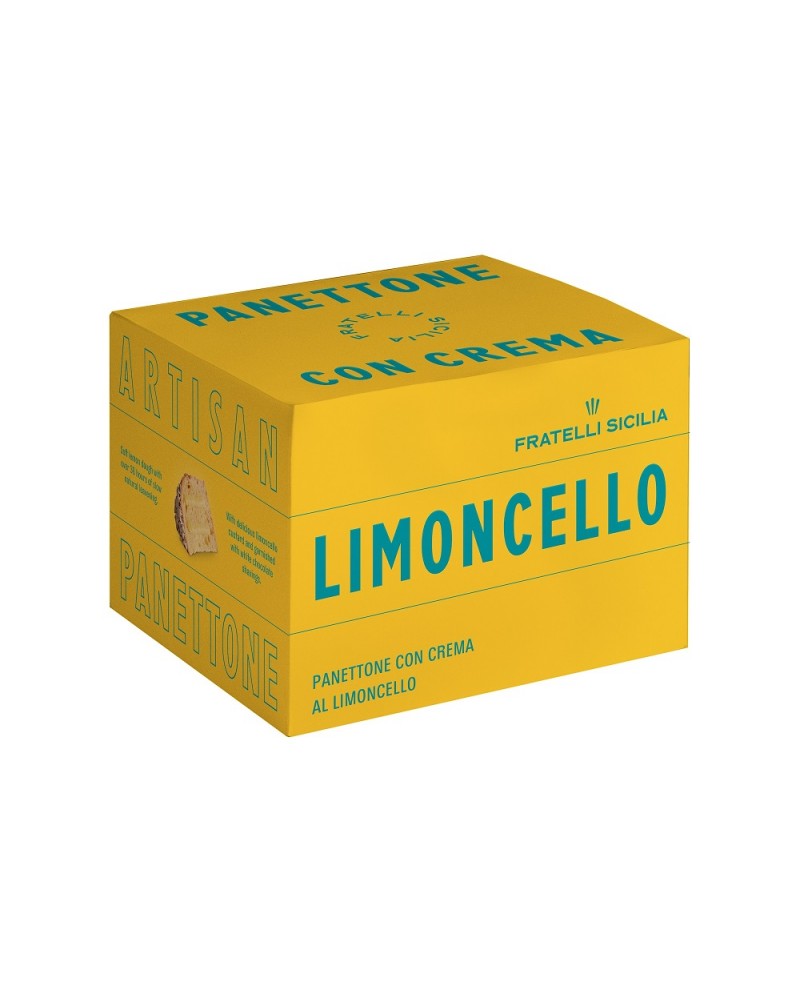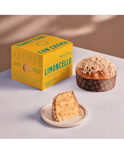 Panettone artigianale da 750 g a lievitazione naturale, caratterizzato da un impasto soffice e arioso. È riccamente farcito con una golosa crema al Limoncello, preparata con liquore al limone, che conferisce un sapore fresco, aromatico e intensamente agrumato. È spesso completato da una glassa o da una spolverata di zucchero a velo.