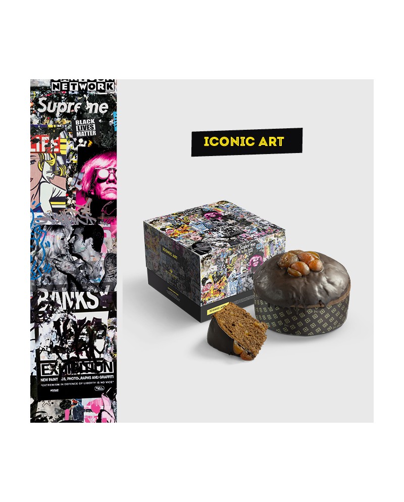 Panettone Iconic Art con impasto al cioccolato e farcitura di albicocca Pellecchiella del Vesuvio. All’estreno una copertura di cioccolato fondente.