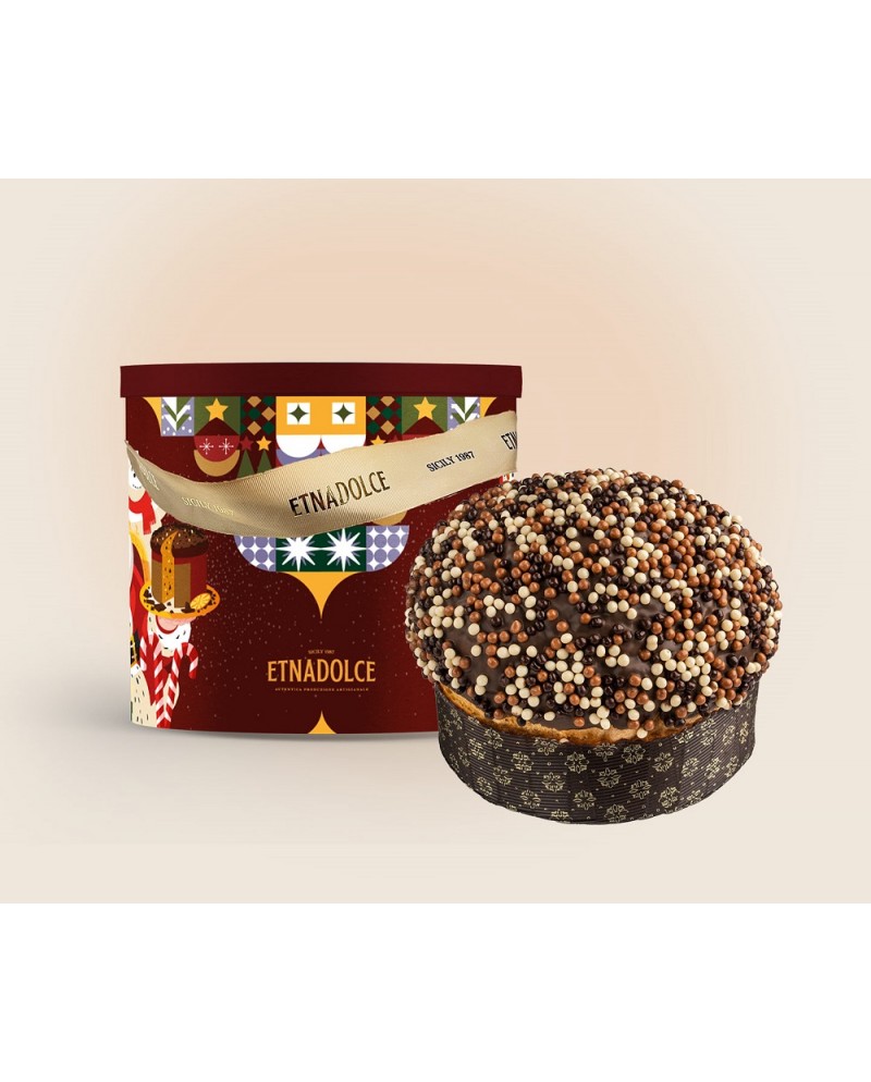 Panettone artigianale al cacao, farcito con crema al cioccolato fondente, ricoperto con glassa al cioccolato al latte e decorato con crispies di cioccolato bianco, latte e fondente (Trilogy di cioccolato).