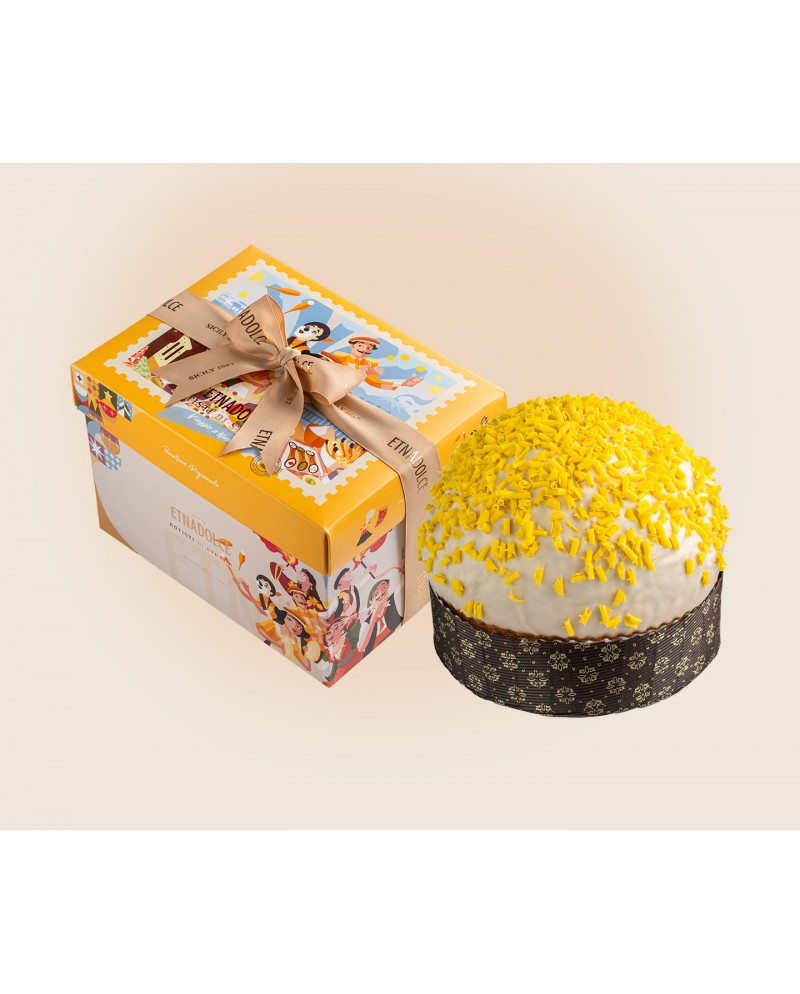 Panettone Limoncello da 1 Kg è farcito con una cremosa delizia al limoncello e ricoperto di cioccolato bianco con trucioli di cioccolato al limone.