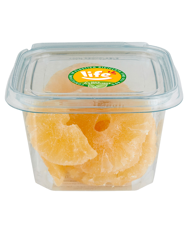Ananas tagliato a fette e sottoposto a disidratazione, dal gusto dolce-acidulo e tropicale. Ottimo come spuntino, fonte di energia e per arricchire ricette dolci e salate.