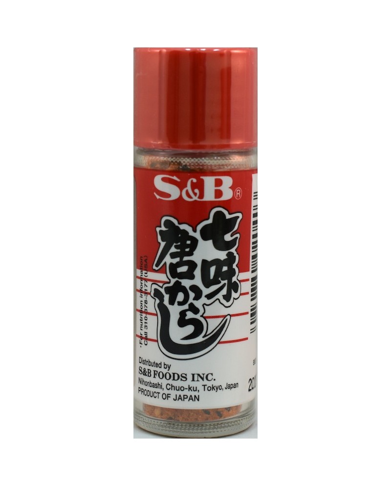 Shichimi togarashi S&B da 15g. Il Nanami Togarashi (chiamato anche Shichimi Togarashi, che significa "Peperoncino ai sette sapori") è una miscela di spezie giapponese complessa e aromatica, utilizzata per aggiungere sia piccantezza che profondità di gusto (Umami) ai piatti. A differenza dell'Ichimi (solo peperoncino), questa miscela combina il peperoncino rosso con altri sei ingredienti, creando un profilo di sapore bilanciato e ricco. È comunemente spolverato su zuppe (come Udon e Soba), Ramen, Gyudon (riso con carne), Yakitori e piatti grigliati.