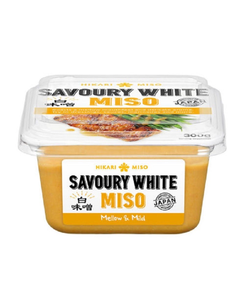 Miso savoury white Hikari miso bianco da 300g. Il Miso Savoury White (noto come Shiro Miso) di Hikari è un tipo di pasta di miso caratterizzato da un colore giallo-bianco e da un tempo di fermentazione breve (spesso solo poche settimane). Questo processo conferisce al miso un sapore dolce, cremoso e delicato, con una sapidità inferiore rispetto ai miso rossi o scuri. Nonostante il nome "Savoury White", è la varietà più dolce e viene ampiamente utilizzato non solo per la Zuppa di Miso leggera, ma anche in salse per condire insalate, come glassa per pesce (es. Gindara Saikyo Yaki) e in dolci o dessert per aggiungere un tocco di Umami complesso.