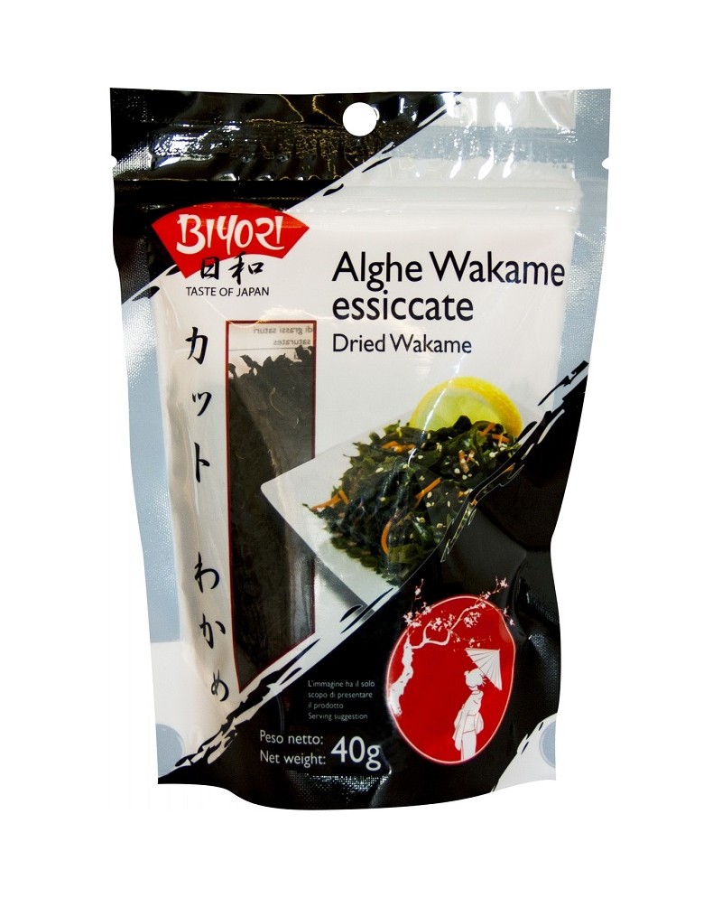 Alghe wakame Biyori da 40g. L'Alga Wakame (Undaria pinnatifida) è un'alga bruna con un gusto delicato e rinfrescante, che la rende una delle alghe più apprezzate da chi si avvicina alla cucina orientale. Viene tipicamente venduta essiccata e, una volta reidratata in acqua fredda per pochi minuti, si espande significativamente, assumendo una consistenza morbida e vellutata. È un ingrediente fondamentale per la zuppa di miso, le insalate e i contorni, ed è nota per essere ricca di vitamine, minerali come calcio e magnesio, e in particolare iodio.