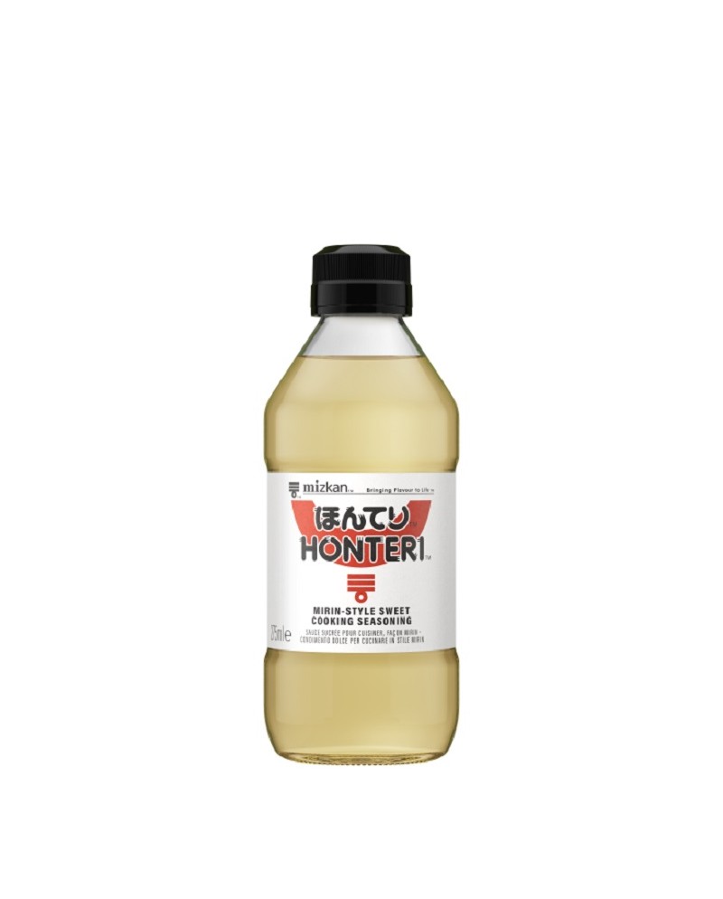 Honteri mirin style mizkan sakè dolce in bottiglia da 275ml. L'Honteri Mirin Style di Mizkan è un popolare condimento a base di sciroppo di glucosio e alcol, creato per replicare il sapore e la brillantezza dell'Hon Mirin (vino di riso dolce autentico), ma con un contenuto alcolico molto più basso (spesso inferiore all'1% o 0% vol.). È chiamato "stile Mirin" o Mirin-fu (Mirin-like) o Aji-Mirin (Mirin per cucinare).