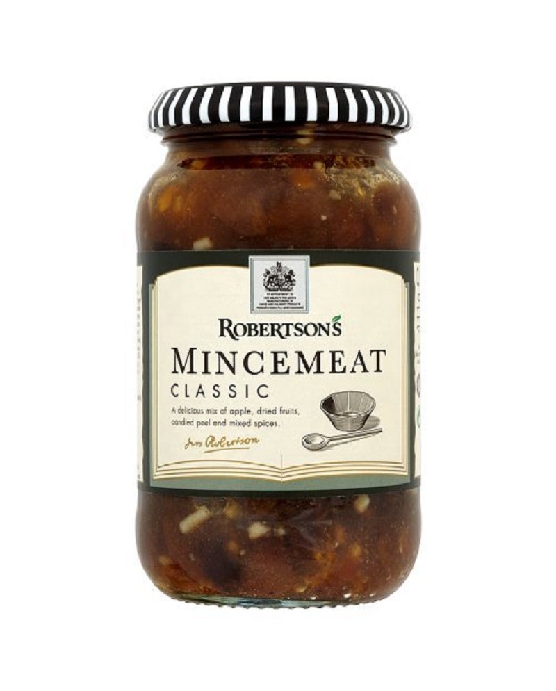 Mincemeat Robertson's in barattolo da 411g. E' un ripieno dolce, denso e aromatico, essenziale per la preparazione delle tradizionali Mince Pies natalizie e altri dolci invernali.
