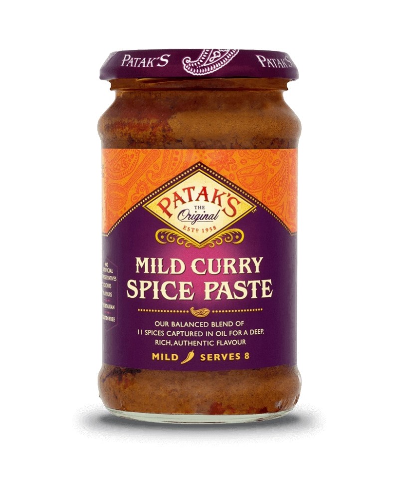 Patak's curry paste mild in barattolo da 283g. Pasta saporita con acqua ed un mix di spezie che comprende coriandolo, paprica, fieno greco, senape e cannella.