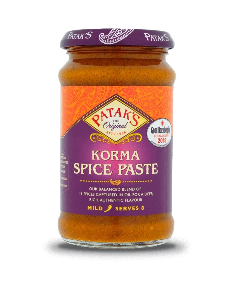 Patak's korma paste in barattolo da 250ml. Gustosa pasta con acqua, olio di colza, farina di mais, sale, senape ed una miscela di spezie con curcuma, coriandolo, cumino e paprica. Da spalmare sul pane o da servire come accompagnamento per carni o insalate.