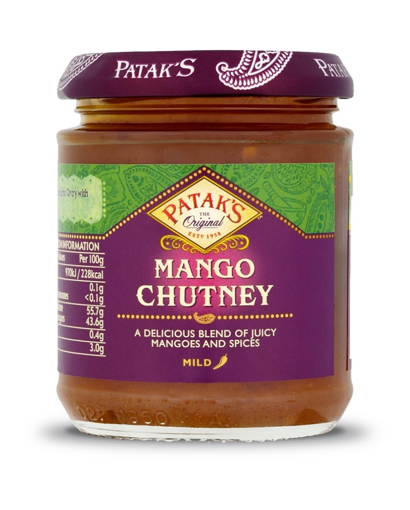 Patak's mango chutney sweet in barattolo da 340g. Chutney di mango morbido con zucchero e spezie ideale per accompagnare piatti della cucina indiana.