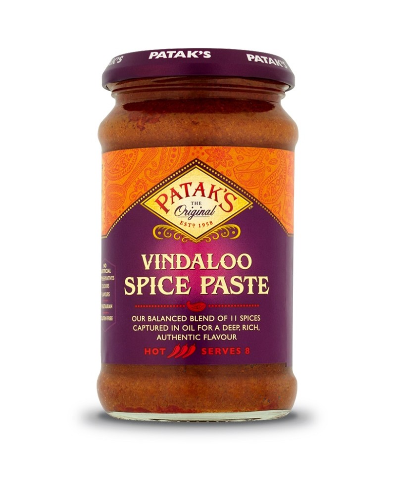 Patak's vindaloo paste in barattolo da 250ml. Blend speziato in olio di colza con senape, tamarindo,paprica e zenzero. Ideale per insaporire il curry.