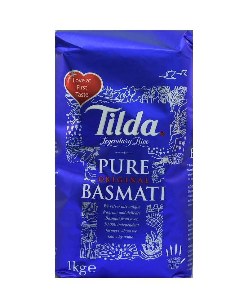 Riso basmati tilda in confezione da 1kg. Puro e di altissima qualità. Coltivato ai piedi dell'Himalaya. Dal sapore raffinato e delicato.